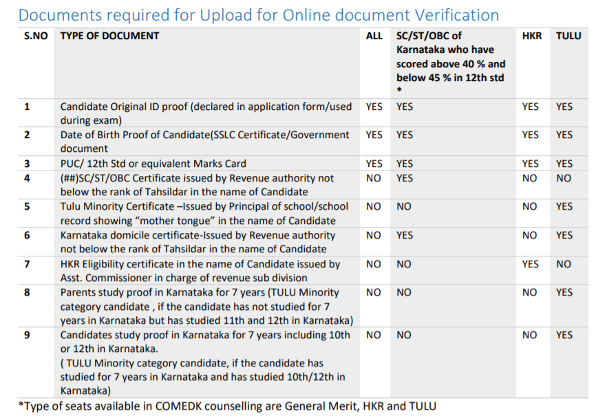 | 9 | Candidates study proof in Karnataka for 7 years including 10th or 12th in Karnataka. (TULU Minority category candidate, if the candidate has studied for 7 years in Karnataka and has studied 10th/12th in Karnataka) | NO | NO | NO | YES |