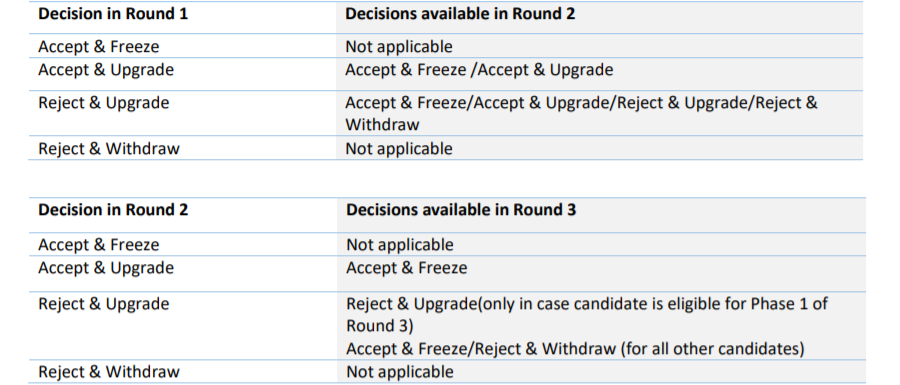 | Last date for reporting for Accept and Freeze candidates of Round 2 | FROM 12 Noon of 19 Dec till 5:30 PM of 22 DEC |