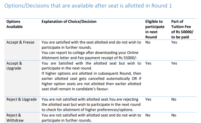 Note: In case, the candidate does not take any action on the seat allotted, it will be considered as Reject & Withdraw and he/she will not be eligible for further rounds.